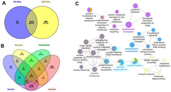 Proteome profiling of AdV-EVs and Ctr-EV. (A) Two-way Venn diagram of proteins identified in Ctr-EVs and AdV-EVs with spectral counts ≥ 2 in 5 biological replicates. 22 and 268 proteins were unique to Ctr-EVs and AdV-EVs, respectively. (B) 4-way Venn diagram showing the intersection between proteins in (A) and the top-100 EV proteins included in the Exocarta and Vesiclepedia repositories. (C) GO and network analysis of proteins found exclusively in AdV-EVs. Nodes represent GO terms with adjusted p-value < 0.05 after Benjamini-Hochberg correction. Ontology sources were Biological Process, Reactome Pathways and Immune System.