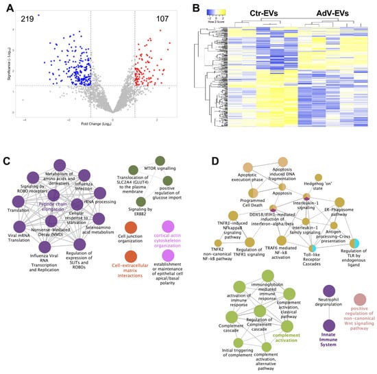 The functional analysis of differentially abundant proteins in AdV-EVs versus Ctr-EVs. (A) A volcano plot of differentially abundant proteins in AdV-EVs versus Ctr-EVs. A total of 107 proteins were more abundant in AdV-EVs (log2FC > 1, p-value < 0.05), and 219 proteins were less abundant in AdV-EVs (log2FC < 1, p-value < 0.05). (B) The hierarchical clustering heatmap of differentially abundant proteins. The data from five biological replicates are shown. The yellow color indicates increased abundance, while the blue color indicates decreased abundance. (C,D) The GO and network analysis of more abundant (C) and less abundant (D) proteins in AdV-EVs. The nodes represent the GO terms with adjusted p-value < 0.05 after the Benjamini-Hochberg correction. Ontology sources were Biological Process, Reactome Pathways, and Immune System.