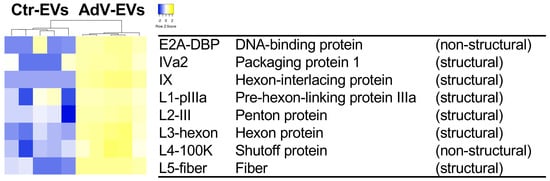 Detection of adenovirus proteins in EVs-AdV. The hierarchical clustering heatmap of six structural and two non-structural HAdV-E4 proteins identified in AdV-EVs. The data from five biological replicates are shown. The yellow color indicates increased abundance, while the blue color indicates decreased abundance.