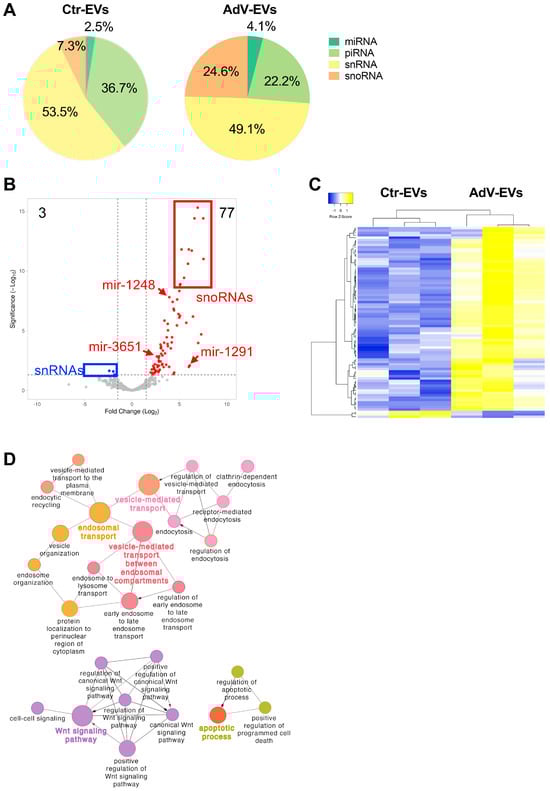 Analysis of the small RNA transcriptome of Ctr-EVs and AdV-EVs. (A) The relative transcript abundance for each class of small RNAs in Ctr-EVs and AdV-EVs. (B) The volcano plot of differentially uploaded small RNAs in AdV-EVs versus Ctr-EVs. A total of 77 small RNAs were up-regulated in AdV-EVs (log2FC > 1, adjusted p-value < 0.05), and three small RNAs were down-regulated in AdV-EVs-(log2FC < 1, adjusted p-value < 0.05). (C) The hierarchical clustering heatmap of differentially uploaded small RNAs. The Data from three biological replicates are shown. The yellow color indicates increased presence, while the blue color indicates decreased presence. (D) The GO and network analysis of mature miRNAs exclusively found in AdV-EVs. The nodes represent GO terms with adjusted p-value < 0.05 after the Benjamini-Hochberg correction. Ontology sources were Biological Process, Reactome Pathways, and Immune System.