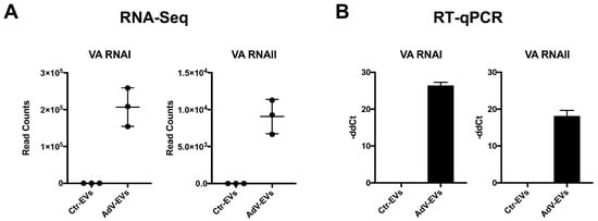 Detection of VA-RNAs in AdV-EVs. (A) The normalized read counts that aligned to the VA RNAI and VA RNAII sequences of the HAdV-E4 genome. The individual data points of three biological replicates are shown. (B) The RT-qPCR expression data of VA RNA I and VA RNA II in Ctr-EVs and AdV-EVs. The data were normalized on ACTB expression and reported as -ddCt relative to EVs-Ctr. The mean ± SEM from two biological replicates is shown.
