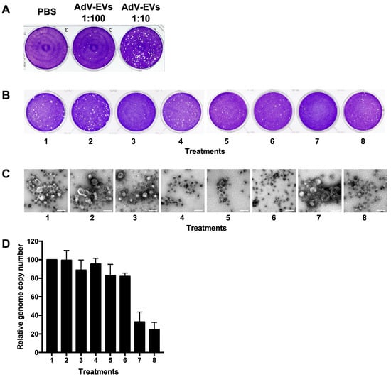 Characterization of EV-associated infectivity. (A) The plaque assay in the A549 cells showing the infectivity of AdV-EVs. (B) The plaque assay performed with AdV-EV preparations subjected to the following treatments: 1, untreated; 2, DNase I; 3, proteinase K; 4, Triton X-100; 5, Triton X-100/proteinase K; 6, Triton X-100/DNase; 7, proteinase K/DNase I; 8, Triton X-100/proteinase K/DNase I. (C) The TEM images of AdV-EVs treated as in (B). Scale bars = 100 nm. (D) The genome copy number quantification by qPCR of AdV-EVs treated as indicated above. The bars represent the ratio of genome copy number/mL of treated AdV-EVs over genome copy number/mL of untreated AdV-EVs. The data are shown as mean of three biological replicates ± SEM.