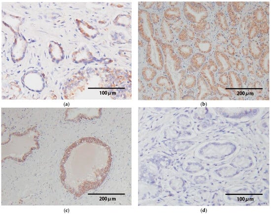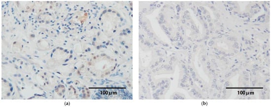 We found that the prevalence of HPV-DNA was 9.6% (15/157 cases) among prostate cancer patients based on a nested PCR analysis. Numerous studies have demonstrated a wide range of HPV prevalence in prostate cancer patients, from 0% to 75% worldwide [10,16,17,18,19,20], and from 0% to 16% in Japan [18,19]. This variability may be the result of small cohorts, differences in HPV detection methods, and differences in the surveyed regions. The prevalence of HPV varies by region, particularly with East Asian populations, which generally show lower rates compared with the global average [20]. Although HPV prevalence in the present study was not considered high, it was consistent with the previous findings in Japan [18,19]. Moreover, the prostate was one of the HPV infectious sites in men; however, HPV-DNA was not detected in the seminal vesicle. To our knowledge, there are no previous reports examining HPV infection in the seminal vesicles. Currently, there is no evidence indicating that HPV can infect the seminal vesicles.