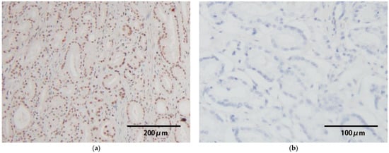 Results of p16INK4a immunohistochemistry are indicated. p16INK4A expression was detected in HR-HPV-positive samples; however, p16INK4a overexpression was not observed, and it was weak ((a), ×200; case 8). On the other hand, p16INK4a was not expressed in the HPV-negative samples ((b), ×200).