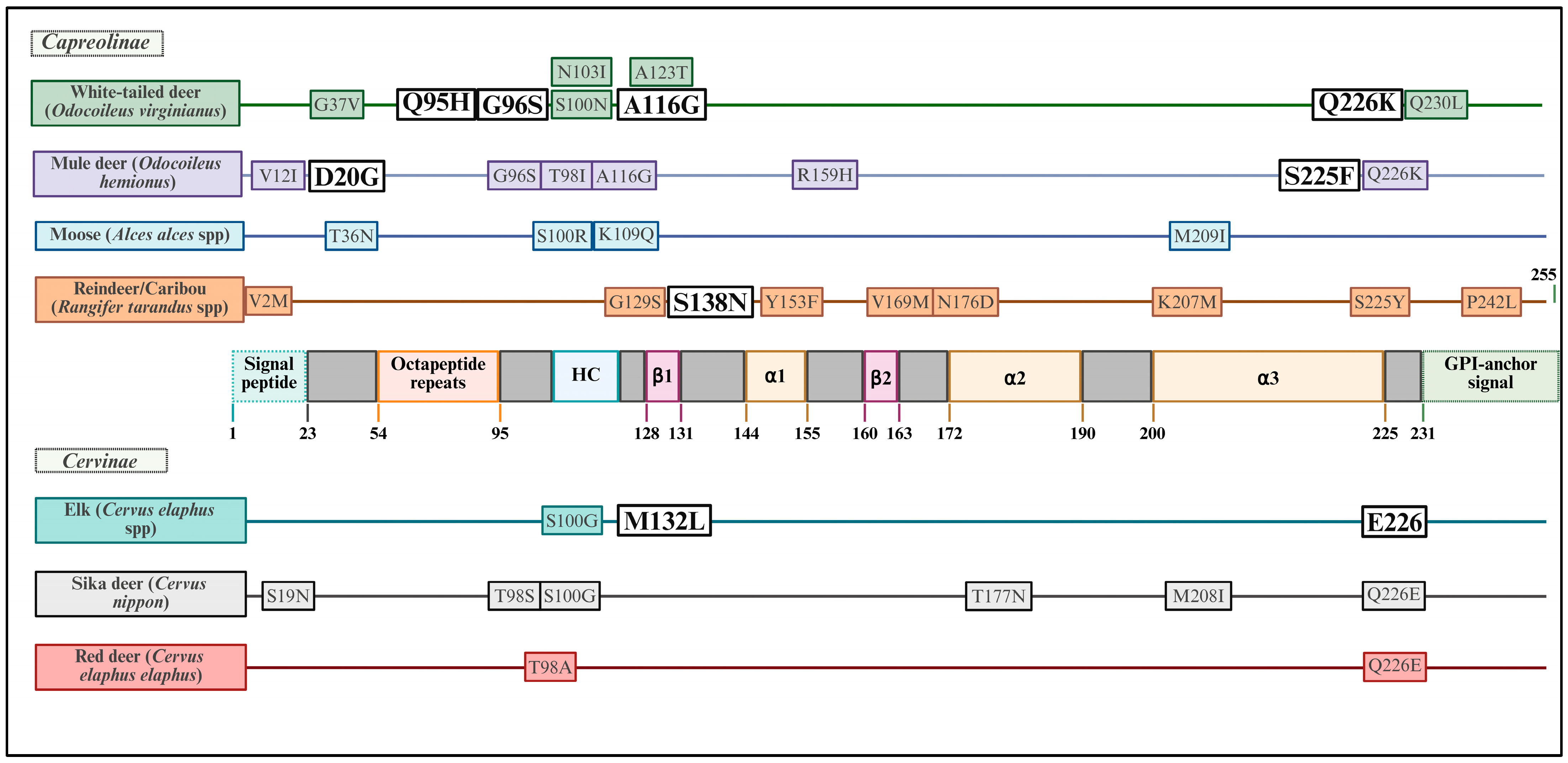 - Arifin, M.I.; Hannaoui, S.; Chang, S.C.; Thapa, S.; Schatzl, H.M.; Gilch, S. Cervid Prion Protein Polymorphisms: Role in Chronic Wasting Disease Pathogenesis. Int. J. Mol. Sci. 2021, 22, 2271. [Google Scholar] [CrossRef]