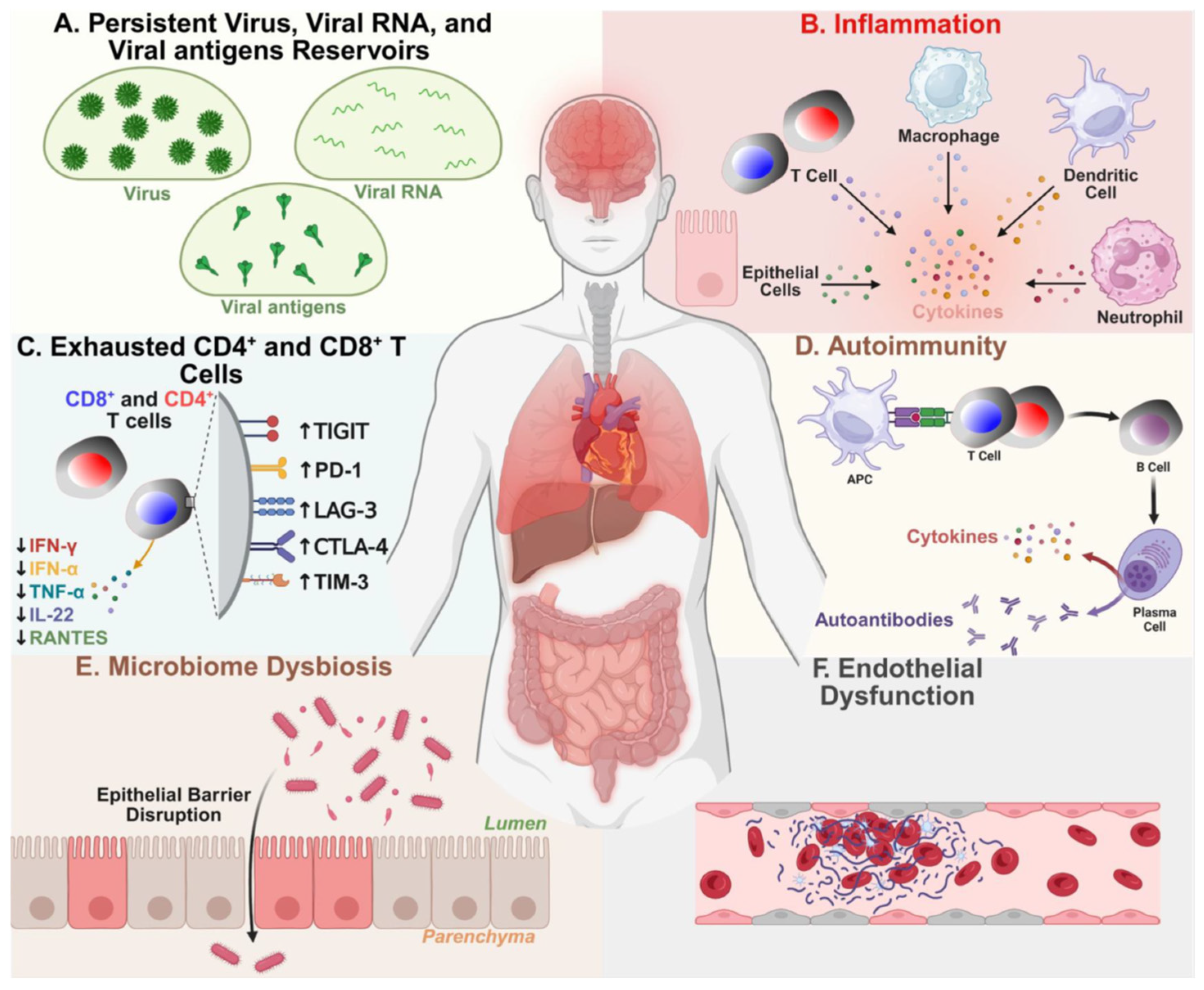 - A potential causative factor of LC, in a large subset of patients, is that reservoirs of virus and/or viral RNA (vRNA) or fragments may persist and replicate in multiple sites of the body, which may drive chronic inflammation and provide continuous viral antigenic stimuli to exhausted CD4+ and CD8+ T cells [31,33,34,35,36]. However, other hypotheses regarding the causative factors of LC include metabolic disturbances, immune dysbiosis, micro-clotting, autonomic dysfunction [38,43,45,46,47], and the reactivation of other non-SARS-CoV-2 viruses, such as HSV-1, HSV-2, EBV, CMV, and HHV-6, which may be a driver of LC [48,49].