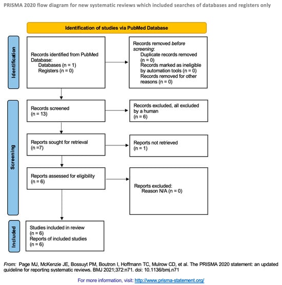 Our PubMed search elicited thirteen total papers, none of which were duplicates. Six papers were excluded based on our inclusion criteria (detailed in Section 2.3), resulting in seven texts. We then sought retrieval of the full articles, one of which was inaccessible due to subscription restrictions, and was thus excluded from our review. Each of these texts then underwent final revision based on our inclusion criteria for inclusion within our systematic review. As all of these papers satisfied our inclusion criteria, they were included within our final review, resulting in six total studied papers.