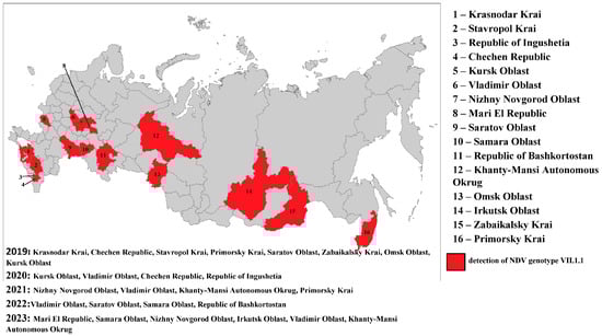 The Russian Federation regions in which subgenotype VII.1.1 NDV isolates were detected in 2019–2023.