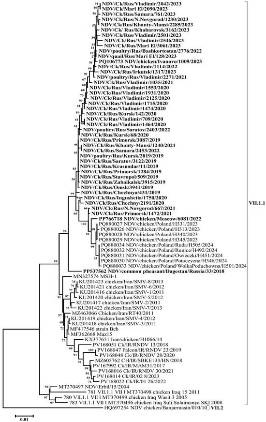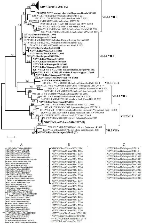 Alignment-based analysis of 94 (54 + 40) F gene fragment sequences enabled the identification of genetic groups/subgenotypes of NDVisolates detected in the Russian Federation during the period 2003–2023. It was shown that 56 isolates belonged to subgenotype VII.1.1, which represents a large and genetically diverse group of NDV. This subgenotype includes viruses that caused the fourth ND panzootic and were previously classified under subgenotypes VII-b, VII-d, VII-e, VII-j, and VII-L [2,31]. In contrast, 28 isolates were assigned to subgenotype VII.2 (VII-i, VII-h) [1,30] (Figure 2).