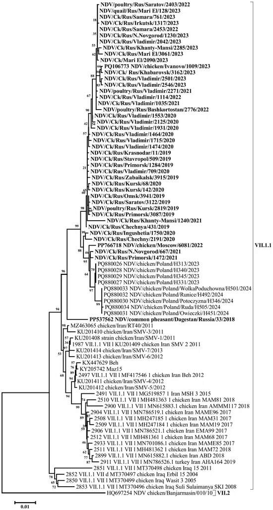 The conducted study established that the formation of the ‘Russian’ NDV isolates of subgenotype VII.1.1 followed several stages. In the early 2000s, ancestral viruses belonging to subgenotype VII-d were detected in the Middle East and Eastern Europe. From these, through intermediate forms identified in Iraq around 2007–2008, a group designated as subgenotype VII-L emerged. This group gave rise to two sister clades: the Iranian subgenotype VII-L and the cluster of isolates from Russia and Poland, whose immediate common ancestor likely existed around 2015–2016, probably in Asia.