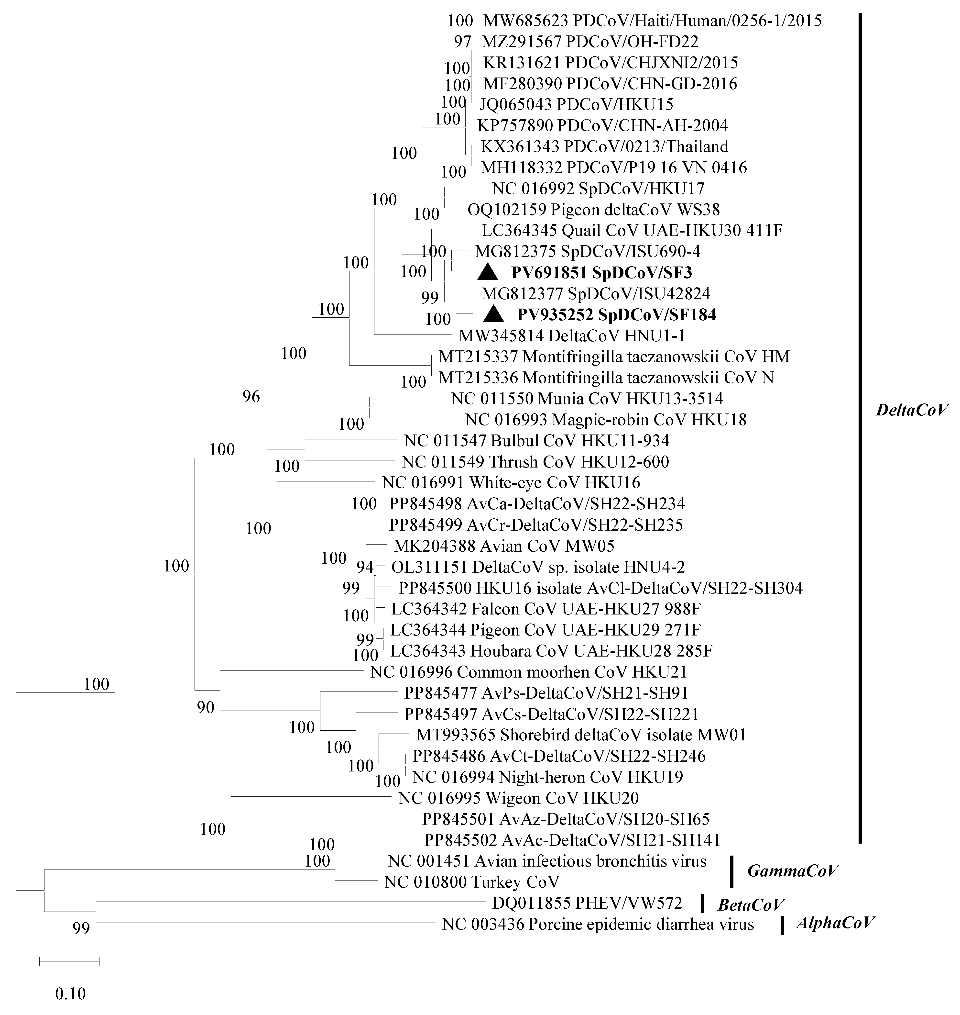Li, D.; Xu, J.; Ames, E.M.; Liu, M.; Aryal, B.; Chellis, M.; Zegpi Lagos, R.; Tonra, C.M.; Wang, Q. Porcine Deltacoronavirus-Related Viruses in House Sparrows. Viruses 2025, 17, 1326. https://doi.org/10.3390/v17101326