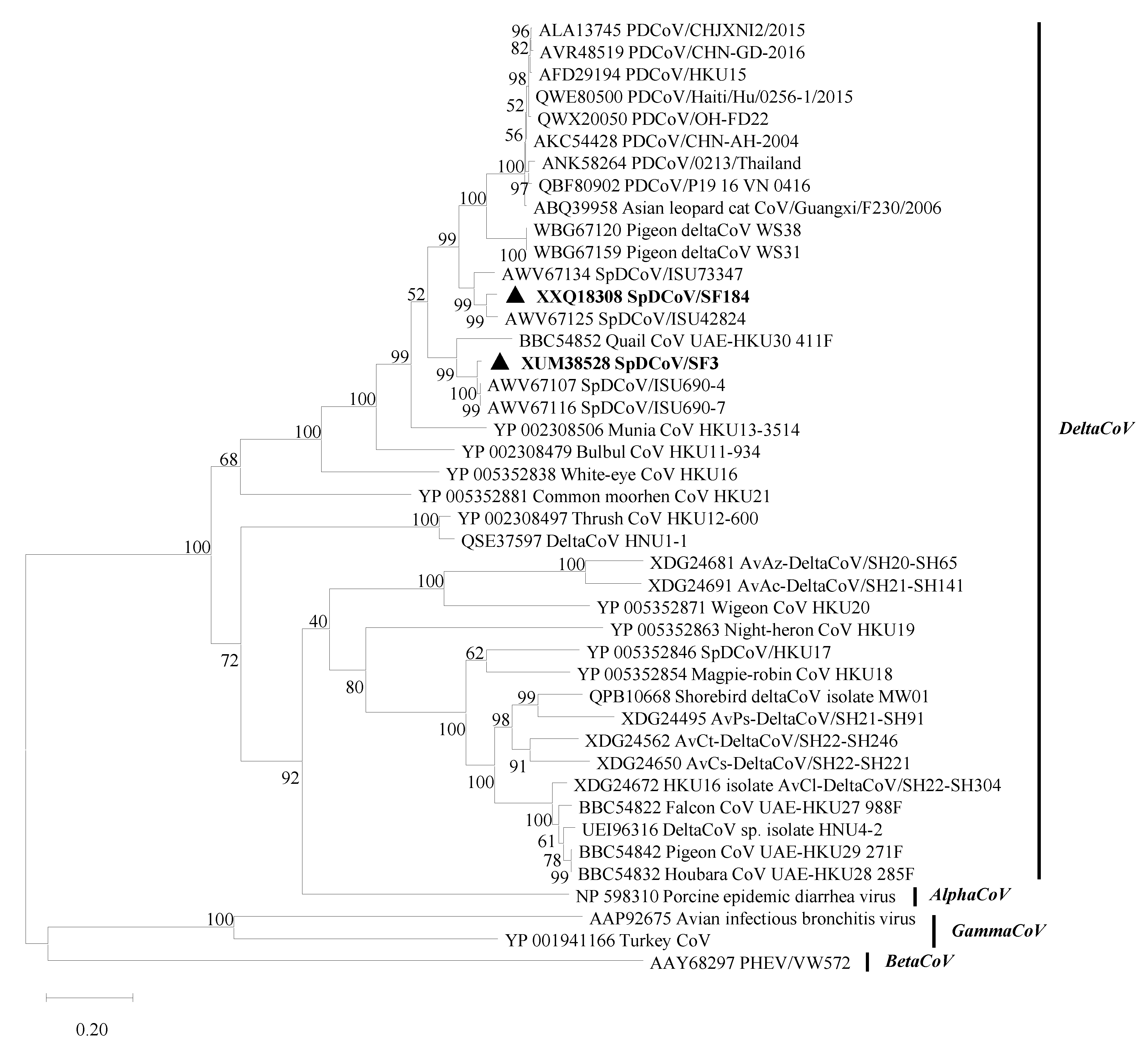 3.2. Genomic Analysis of SpDCoV Strains SF3 and SF184