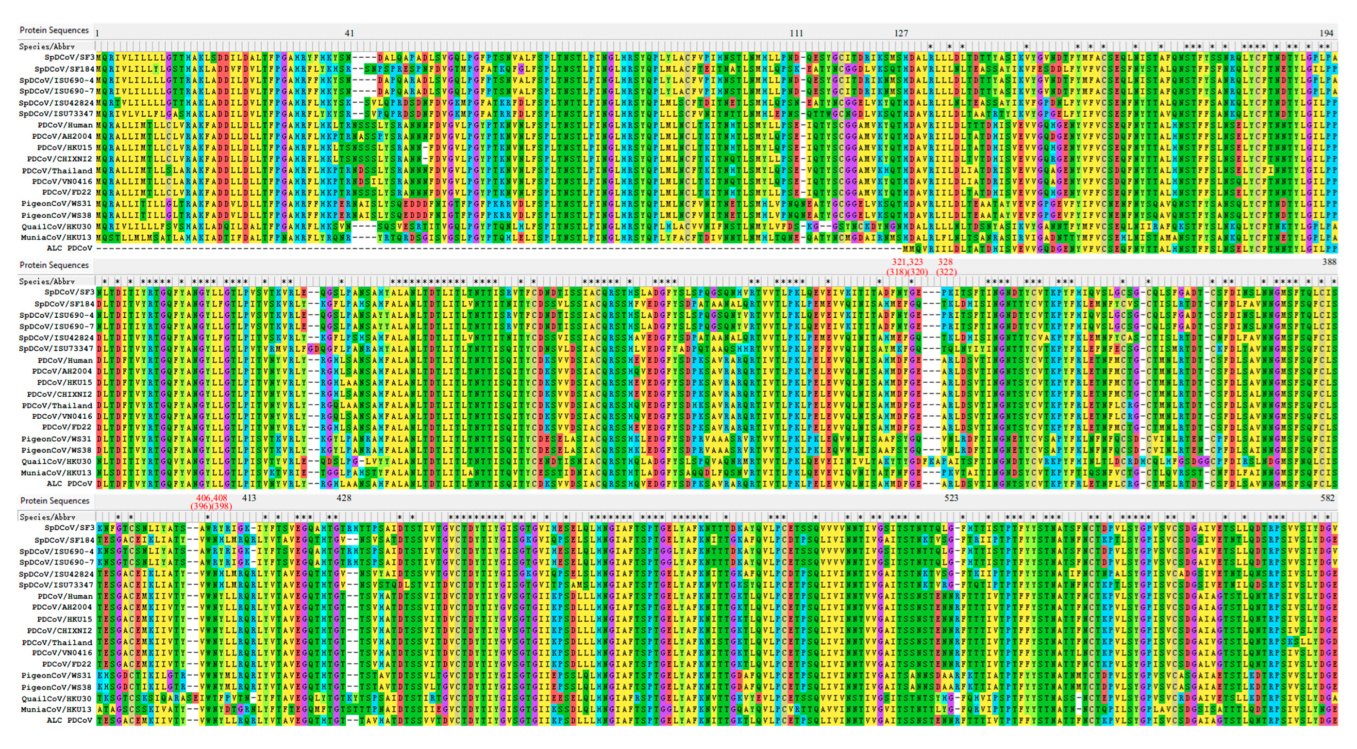 3.3. The S Proteins of SpDCoVs Have Specific INDELs Compared with PDCoVs