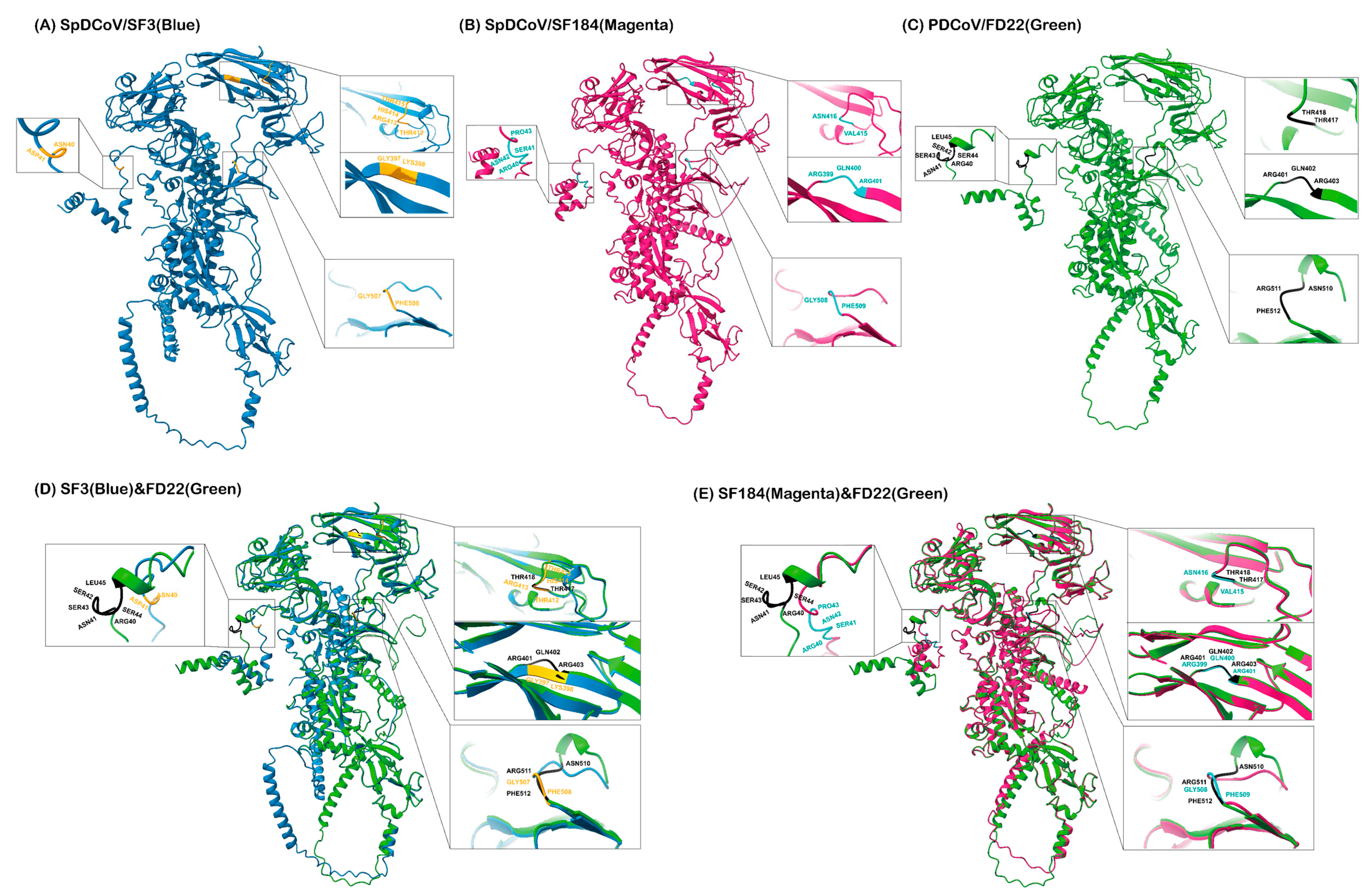 3.4. Prediction of S Protein 3D Structures Revealed That SpDCoV SF184 Strain Is Closer to PDCoV than SF3