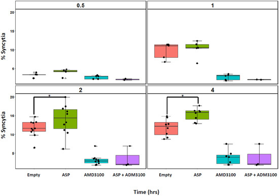 A previous study reported that, during viral replication, ASP localizes at the plasma membrane where it is detectable in close proximity of gp120 [12]. Thus, we sought to assess the hypothesis that plasma membrane-associated ASP plays a role in HIV-1 envelope-mediated fusion. We first used a transient co-culture system to monitor the formation of syncytia. We engineered a co-culture model combining, on the one hand, HEK-293T cells constitutively expressing the CXCR4-tropic envelope glycoproteins gp120/gp41 and the fluorescent protein, mCherry (HEK-Env-mCherry) and, on the other hand, HuT 78-GFP cells expressing CD4, CXCR4, and GFP (Figure S1). The two cell lines were co-cultured at a 1:1 ratio to validate our system via observation and quantification of syncytia by fluorescence microscopy and flow cytometry (Figure S1). Following this validation, we conducted several controls. First, we assessed the formation of syncytia in the presence of AMD3100, which antagonizes CXCR4 and prevents interaction with gp120 [23]. We did not observe any cell fusion in the presence of AMD3100, regardless of whether the HEK-Env-mCherry cells expressed ASP. Next, we evaluated whether the expression of ASP alone in the absence of Env expression could induce syncytia formation. For this purpose, parental HEK 293T cells were transfected with either an empty vector or a vector expressing ASP. Cell fusion and syncytia formation were not observed by light microscopy after 24 h of co-culture with HuT 78 cells (Figure S2). Subsequently, we investigated the subcellular localization of ASP in HEK 293T-Env cells transfected with the optimized pCAGGS-ASP plasmid (Figure S3). Finally, HEK-Env-mCherry cells were transfected with either an empty vector or a vector expressing ASP, and then they were co-cultured with HuT 78-GFP cells. Syncytia formation was assessed after 30 min, 1 h, 2 h, and 4 h of co-culture. At 2 and 4 h post co-culture, we observed a significant increase in the percentage of syncytia in co-cultures containing HEK293T-Env-mCherry expressing ASP compared with the control co-cultures (p = 0.0273 at 2 h and 4 h post co-culture) (Figure 1 and Figure S4). Moreover, our analyses showed an overall trend toward increased syncytium size at 4 h post co-culture in the presence of ASP compared with the control cultures, suggesting a higher number of cell–cell fusion events (Figure S1).