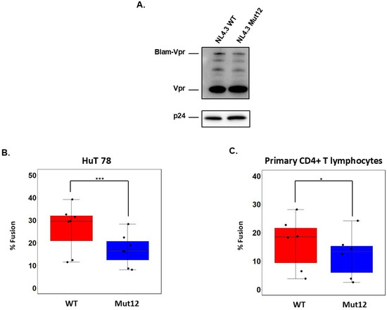 Blam-Vpr Assay was performed as previously described [18]. Briefly, viruses containing Blam-Vpr were produced in HEK 293T cells by co-transfection of Blam-Vpr expression vector and molecular clones. Viruses were prepared as described in the “Viruses” Section of the Materials and Methods. A total of 0.5 × 106 HuT 78 or primary CD4+ T cells plated in 24-well plates were infected with 1 µg (eq. p24) of viruses for 3 h at 37 °C. After several washes, cells were loaded with a CCF2-AM loading kit (Invitrogen) at room temperature for 2 h and washed. Another incubation was performed overnight at room temperature in CCF2 development media [19]. Cells were analyzed by flow cytometry using the NovoExpress software (version Windows 10).