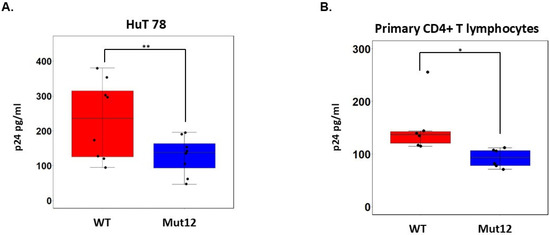 Given these results, we performed binding assays to determine whether ASP expression on the viral envelope affects attachment of the virus to HuT 78 or primary CD4+ lymphocytes. The results shown in Figure 4 show that ASP Mut12 viruses exhibit a significantly lower binding capacity compared with WT viruses (HuT 78 cells: Wilcoxon signed-rank test; p = 0.007813; primary CD4+ T cells: linear mixed-effect model; p = 0.0328).