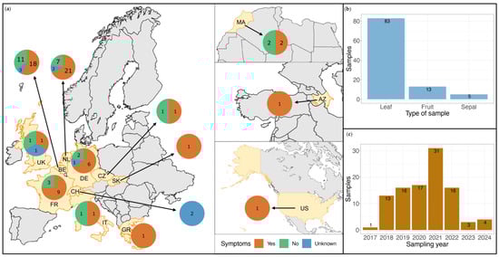 Sample-set overview. (a) The 13 countries where the analyzed samples were collected are indicated in yellow on the map and labeled with their two-letter code: BE—Belgium, NL—the Netherlands, DE—Germany, UK—the United Kingdom, CH—Switzerland, FR—France, MA—Morocco, IT—Italy, US—the United States of America, CZ—Czech Republic, SK—Slovakia, GR—Greece, AZ—Azerbaijan. The number of collected samples and their symptom status are presented in the pie charts of each country. The number of samples is indicated in black numbers and the symptom status is indicated in color: orange for symptomatic samples, green for non-symptomatic samples, and blue for samples for which the presence of symptoms was unclear; (b) Sample type overview of the sample-set; (c) Sampling year overview of the sample-set.