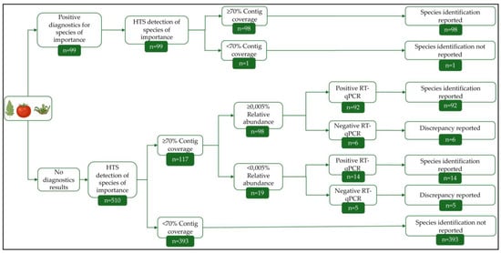Modified identification reporting decision tree for the 6 viral species of interest for tomato cultivation (PepMV, ToBRFV, STV, ToTV, ToFBV, CMV); n indicates the number of cases fulfilling the decision criteria for each step.