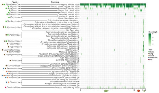 For 68 of the 101 analyzed plant samples (collected from commercial tomato greenhouses), viral reads represented the majority of the obtained reads (≥50.0%). The analysis of all 101 samples resulted in the identification of 43 viral species belonging to 25 families. The findings for each sample are presented in Figure 3. The websites of the International Committee on Taxonomy of Viruses (ICTV) and ViralZone [48] were used to determine the known host range of viruses belonging to these 25 viral families identified in the HTS analysis (Figure 3). Plants are known to be the only hosts for 7 families, fungi for 7, and insects for 1 (Figure 3). Some viral families are known to contain members able to infect more than 1 host group. Four such families were found containing members infecting both plants and fungi, 1 infecting both fungi and vertebrates, and 4 infecting both insects and vertebrates (Figure 3). Additionally, the Caulimoviridae family of plant viruses was identified to correspond to endogenous viral elements (EVEs) integrated into the tomato genome (Figure 3).