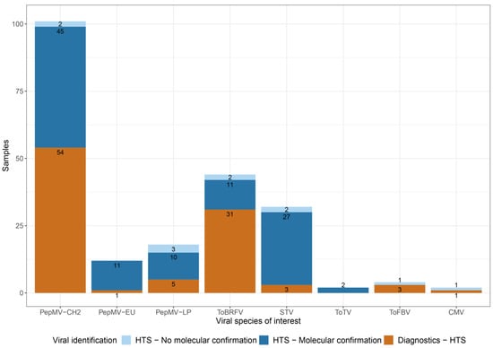 Identification overview of 6 viral species of interest for tomato cultivation. x-axis: Viral species: pepino mosaic virus Chilean genotype (PepMV-CH2), pepino mosaic virus European genotype (PepMV-EU), pepino mosaic virus Peruvian genotype (PepMV-LP), tomato brown rugose fruit virus (ToBRFV), southern tomato virus (STV), tomato torrado virus (ToTV), tomato fruit blotch virus (ToFBV), cucumber mosaic virus (CMV); y-axis: number of samples. The bars correspond to cases of viral identification in the sample set for each of the 6 viral species of interest. The bars are colored to distinguish between three identification types: cases of initial molecular detection during diagnostics analysis that were confirmed by HTS are colored orange, cases of initial detection during the HTS analysis that was confirmed afterward by RT-qPCR are colored dark blue, cases of initial detection during the HTS analysis that could not be confirmed with RT-qPCR are colored light blue.