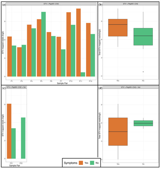 Association of STV presence with symptom presence. x-axis: Panels (a,c)—Pairs of symptomatic and non-symptomatic samples collected from the same commercial greenhouse, for which at least one member contained STV reads, Panels (b,d)—Total of symptomatic and non-symptomatic samples with STV identification; y-axis: Reads mapped on the STV genome on a logarithmic scale; the symptom status of samples is indicated in color: orange for presence and green for absence of symptoms. (a) Association of STV presence with symptom presence for samples with double infection (STV and PepMV-CH2) identification. Each of the 9 sample pairs is represented by two bars, one corresponding to the reads of the symptomatic sample (orange) and one corresponding to the reads of the non-symptomatic sample (green); (b) Association of STV presence with symptom presence for samples with double infection (STV and PepMV-CH2) identification. Boxes represent the total amount of STV reads obtained for each symptom status, the mean number of reads is indicated with a horizontal black line, Wilcoxon signed-rank test revealed no statistically significant difference between the two mean values (p-value: 0.1); (c) Association of STV presence with symptom presence for samples with identification of triple infection (STV, PepMV-CH2 and one additional virus of interest. Each of the 2 sample pairs is represented by two bars, one corresponding to the reads of the symptomatic sample (orange) and one corresponding to the reads of the non-symptomatic sample (green); (d) Association of STV presence with symptom presence for samples with identification of triple infection (STV, PepMV-CH2 and one additional virus of interest). Boxes represent the total amount of STV reads obtained for each symptom status, and the mean number of reads is indicated with a horizontal black line, The Wilcoxon signed-rank test revealed no statistically significant difference between the two mean values (p-value: 0.06).