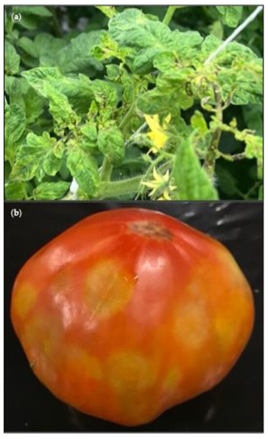 With production volumes reaching 192 million tons in 2023, and a global cultivation coverage of 5.4 million hectares (ha), tomato (Solanum lycopersicum) is one of the world’s most economically important crops [6]. Hence, damage caused by viral infection in the form of yield loss or reduced fruit quality can have an enormous impact on the tomato value chain [7,8]. So far, 181 viral species have been associated with disease in tomato [9]. The severity of each disease depends on the infecting virus species and the climate of the growing region [1,10].