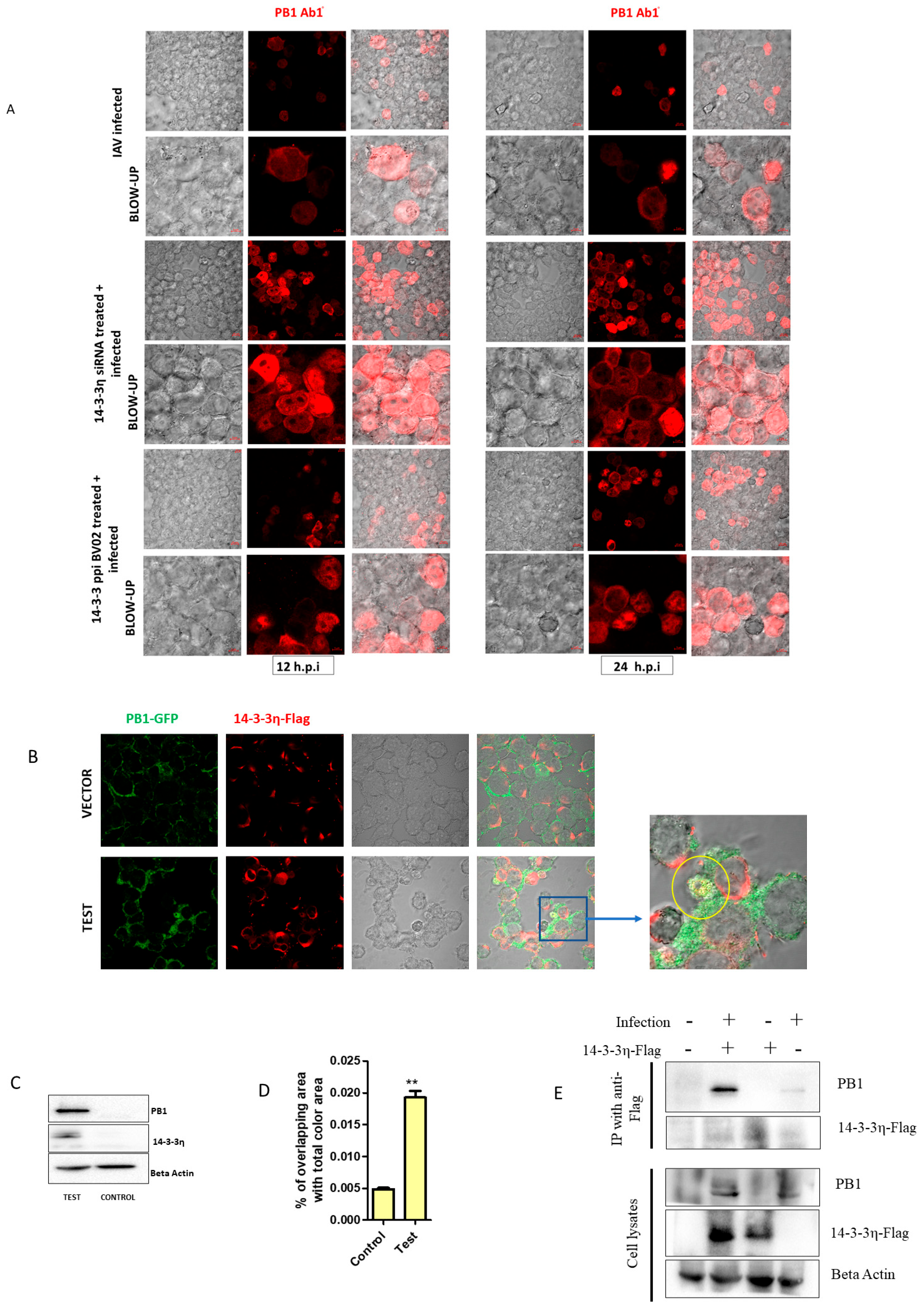 To identify which viral gene is responsible for inducing 14-3-3η, we transfected HEK293 cells with all eight protein expression plasmids of influenza A virus. Western blot analysis revealed that PB1 transfection produced the strongest 14-3-3η response. Confocal microscopy confirmed PB1 expression at both 12 h.p.i. and 24 h.p.i. (