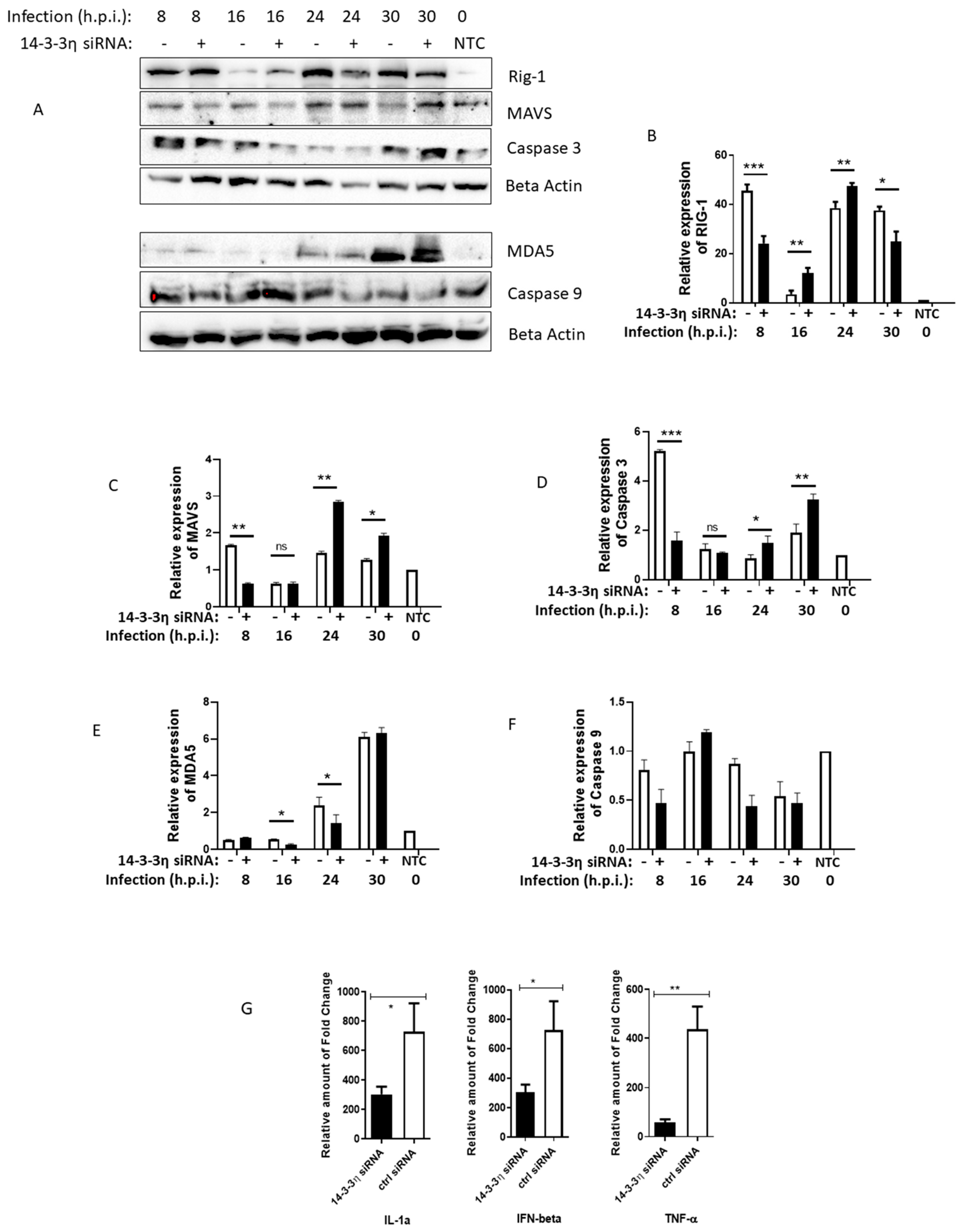 28], we analysed its role in modulating MDA5–MAVS–caspase signalling. Our data show that influenza virus infection enhances caspase 3 activity, which peaks around 30 h.p.i. Notably, 14-3-3η knockdown impaired cytokine induction (IL-1α, IFN-β, TNF-α), which is consistent with defective RLR signalling.