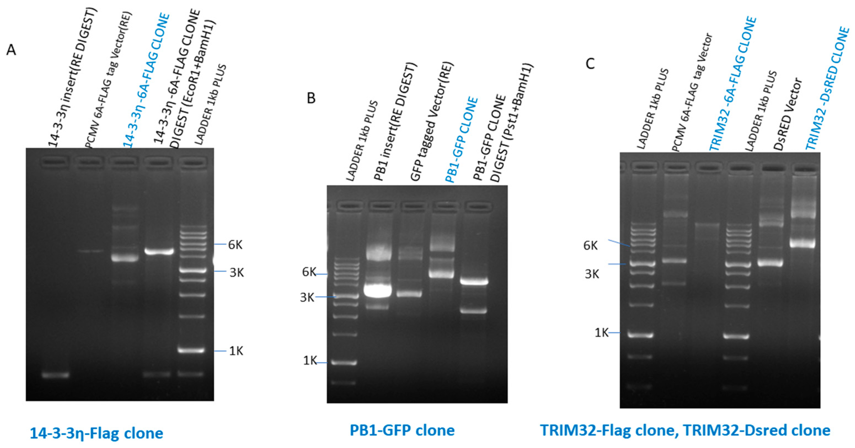 PstI). Cloned plasmid constructs were made and checked, namely 14-3-3η–PCMV 6A (FLAG-tagged), PB1–GFP, TRIM32–PCMV 6A (FLAG-tagged), and TRIM32–DsRed (
