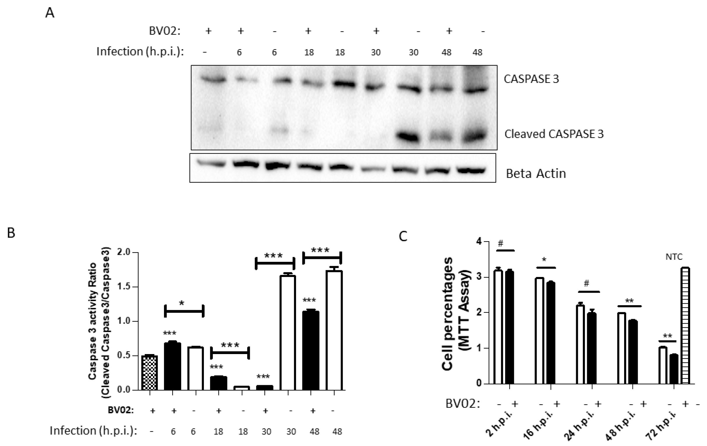 Figure 2A). Consistent results were obtained upon pharmacological inhibition of 14-3-3 using BV02, which confirms the antiviral role of 14-3-3η. Cell viability assays (MTT) further revealed that 14-3-3η inhibition compromised cell survival in a time-dependent manner.
