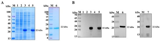 Expression and purification of PCV3 ΔN33Cap protein. SDS-PAGE (A) and Western blot (B) analysis of ΔN33Cap protein expression and purification. Lane M: Protein marker; lane 1: IPTG-induced E. coli BL21(DE3) lysate with empty vector pET-30a; lane 2: uninduced E. coli BL21(DE3) lysate with pET-30a-ΔN33Cap; lane 3: IPTG-induced E. coli BL21(DE3) lysate with pET-30a-ΔN33Cap; lane 4: supernatant of IPTG-induced E. coli BL21(DE3) lysate with pET-30a-ΔN33Cap; lane 5: inclusion bodies of IPTG-induced E. coli BL21(DE3) lysate with pET-30a-ΔN33Cap; lane 6 and 7: purified ΔN33Cap protein. Lanes 1 to 6 are for the Western blot of anti-His-Tag, and Lane 7 is for the Western blot of positive serum.