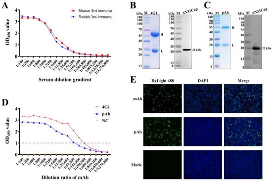 Purified ΔN33Cap protein (1 mg/mL) was emulsified in a 1:1 ratio with Freund’s complete adjuvant (Biodragon, Suzhou, China). BALB/c mice were immunized by subcutaneous multi-point injection (200 μL) in the cervical dorsal region. Two weeks later, two booster immunizations were given at 2-week intervals using Freund’s incomplete adjuvant (Biodragon, China) via the same injection protocol. Three weeks after the third immunization, mice received an intraperitoneal antigen boost. Three days post-boost, splenocytes were isolated and fused with SP2/0 myeloma cells using polyethylene glycol (PEG-1500)-mediated fusion (Sigma-Aldrich, St. Louis, MO, USA). Hybridoma cells were cultured in HAT medium and followed by HT medium (Sigma-Aldrich, St. Louis, MO, USA) for initial screening. Cell culture supernatants were screened by indirect ELISA to identify positive hybridoma clones. Positive clones underwent three rounds of subcloning via limiting dilution, with repeated indirect ELISA validation to select stable antibody-secreting clones. For ascites production, mice were pre-stimulated with a special adjuvant for ascites (Biodragon, China) for two weeks prior to intraperitoneal injection of 1 × 106 hybridoma cells. Ascitic fluid was collected after approximately 10 days, clarified by centrifugation (1000× g, 10 min, 4 °C), and further purified using Protein A/G affinity chromatography (Beyotime, Shanghai, China) according to the manufacturer’s protocol.