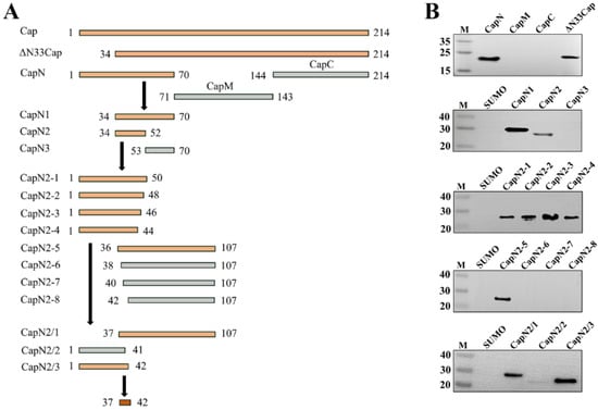 The ΔN33Cap protein was successfully expressed in E. coli BL21(DE3) using a prokaryotic expression system. SDS-PAGE analysis showed that the purified protein revealed a distinct band at approximately 22 kDa, consistent with the predicted molecular weight (Figure 1A). Subsequent Western blot analysis using an anti-6×His tag monoclonal antibody also confirmed the presence of the ΔN33Cap protein at the expected size (Figure 1B).
