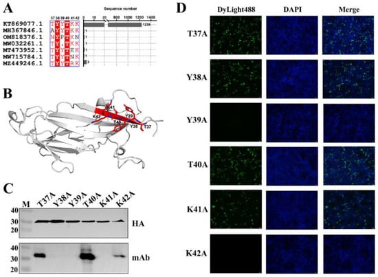 To identify the minimal linear epitope recognized by the mAb, a series of truncated Cap proteins were generated (Figure 3A). Western blot revealed the minimal binding epitope as the hexapeptide 37DYYDKK42 (Figure 3B), located within the first β-sheet of the N-terminal domain of the Cap protein (Figure 4B). Statistical analysis of the amino acid sequence alignment of PCV3 Cap reveals that the hexapeptide segment is highly conserved. Systematic alanine-scanning mutagenesis further validated critical residues within this epitope. Western blot results demonstrated that substitutions at positions Y38A, Y39A, and K41A completely abolished mAb binding, as evidenced by the absence of specific bands (Figure 4C). In parallel, IFA revealed that mutations targeting the conformational epitope (Y39A and K42A) also disrupted mAb recognition, with no detectable green fluorescence observed in the nuclei (Figure 4D).