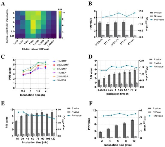 Optimization of reaction conditions for DAS-ELISA. (A): The optimal matching of the pAb coating concentration and the HRP-mAb working dilution ratio, P/N values are displayed in the heat map as color shades. (B): The optimal pAb coating conditions. (C): The optimal blocking solution and optimal blocking time; (D): The optimal incubation time of serum; (E): The optimal incubation time of HRP-mAb; (F): The optimal color development time of TMB substrates. Positive values and negative values are presented in a bar chart with bar values; P/N values are presented in a line chart.
