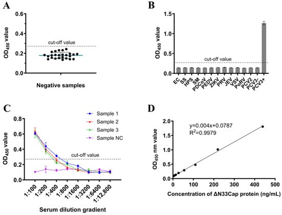 Performance validation of DAS-ELISA. (A) Negative sera were tested using DAS-ELISA for calculating the cut-off value. The cut-off value is + 3 SD. (B): Specificity test of DAS-ELISA. (C): Sensitivity test of DAS-ELISA. (D): The linear standard curve for detecting Cap protein using DAS-ELISA.