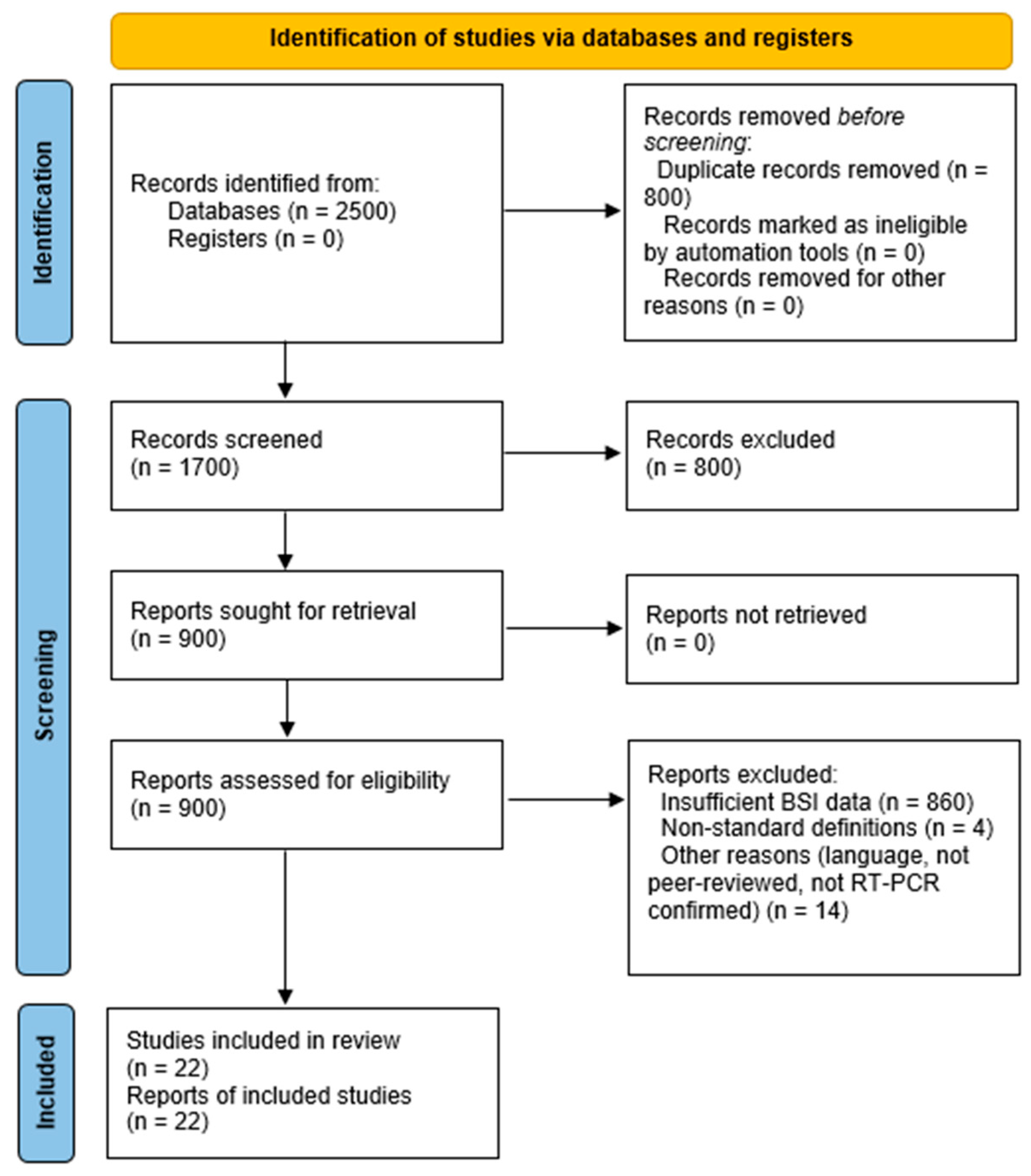 | BSI Prevalence (Overall) | 8.2% | 5.7–11.0 | 3.0–15.5 | <0.001 | 50 | 22 [3,4,6,7,8,10,13,14,15,16,17,18,19,20,21,22,23,24,25,26,27,28] |