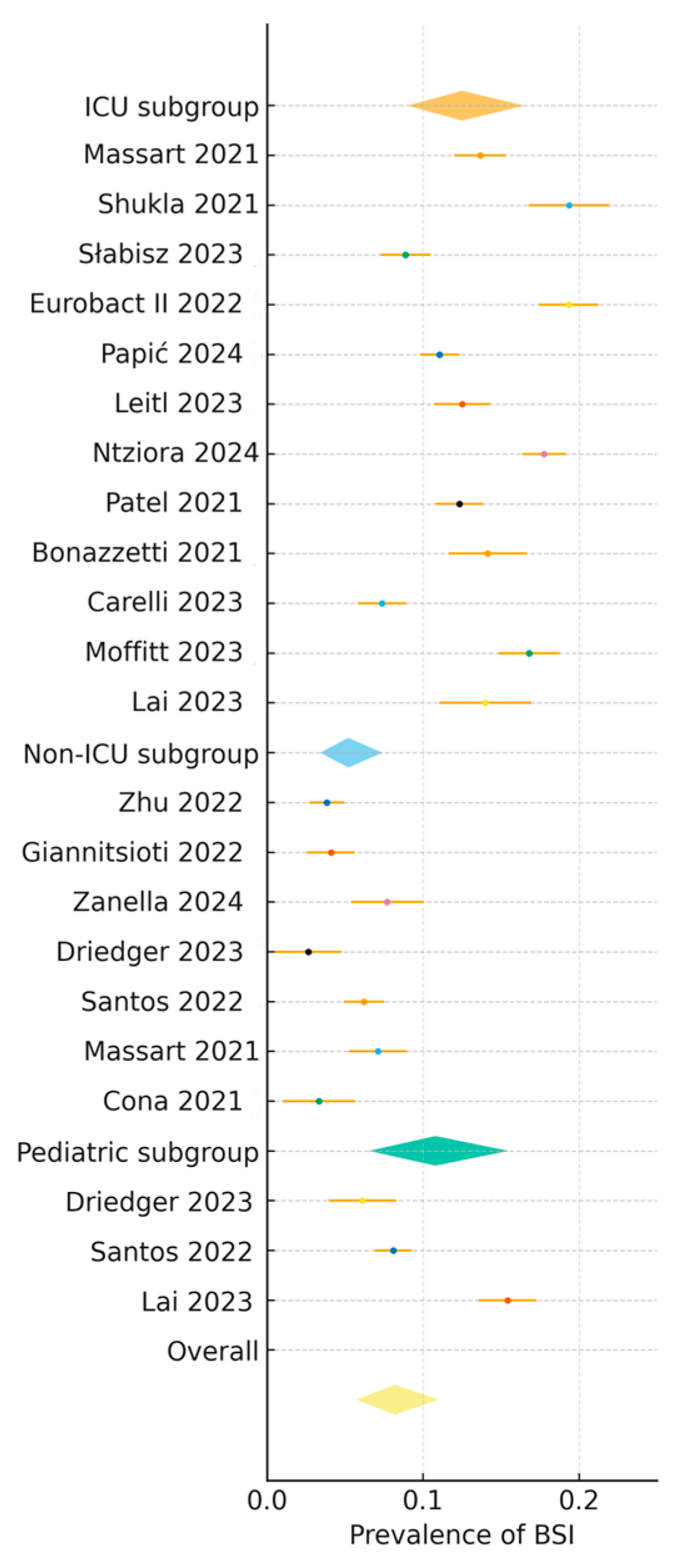 | BSI Prevalence (ICU) | 12.5% | 9.0–16.5 | 5.5–21.0 | <0.001 | 42 | 12 [3,6,7,8,10,11,13,14,15,17,23,24] |