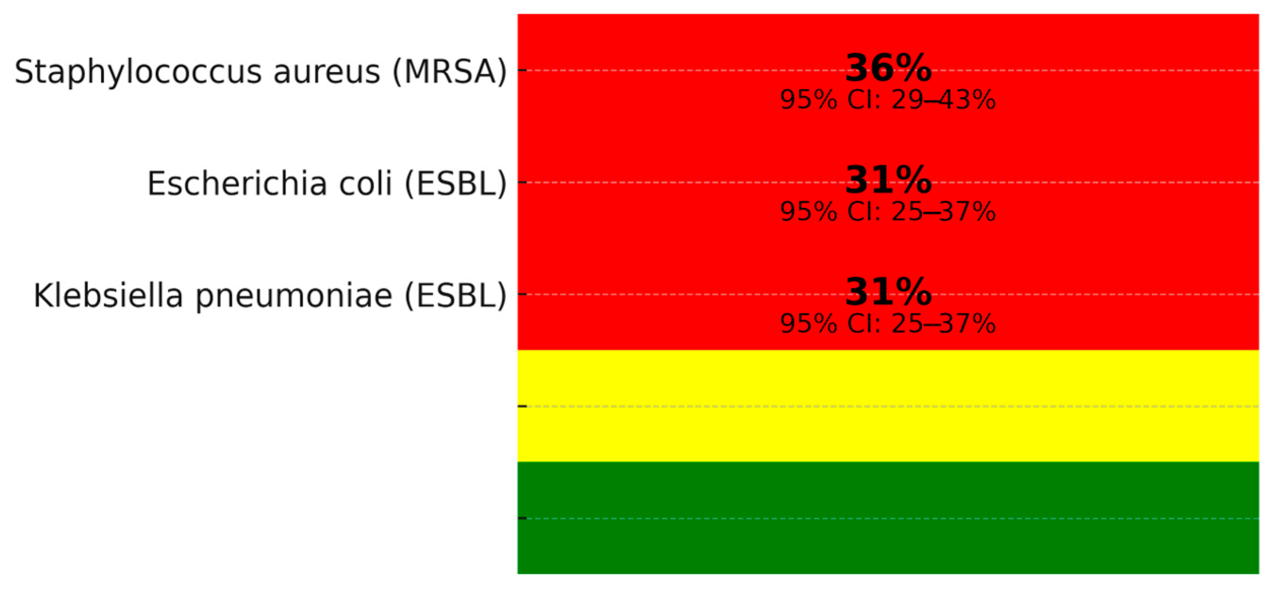 | Escherichia coli | 4 | 2–7 | 240 | 10 [3,4,6,8,10,16,20,26,27,28] | ESBL rate: 31% (95% CI: 25–37). |