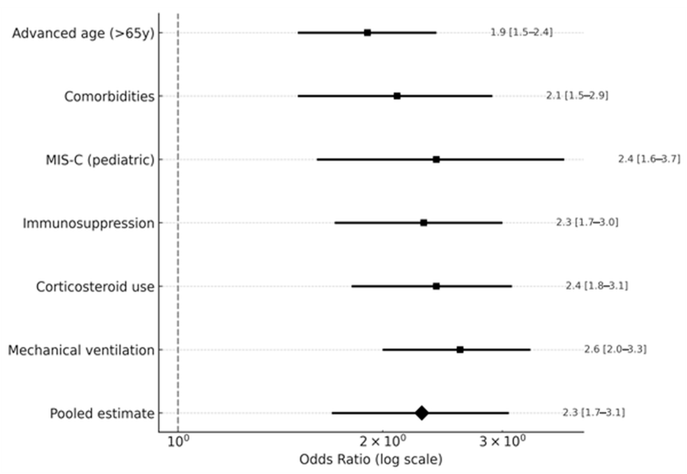 | MIS-C (Pediatric, OR) | 2.4 | 1.6–3.7 | 1.1–5.1 | <0.001 | 42 | 3 [19,20,22] |