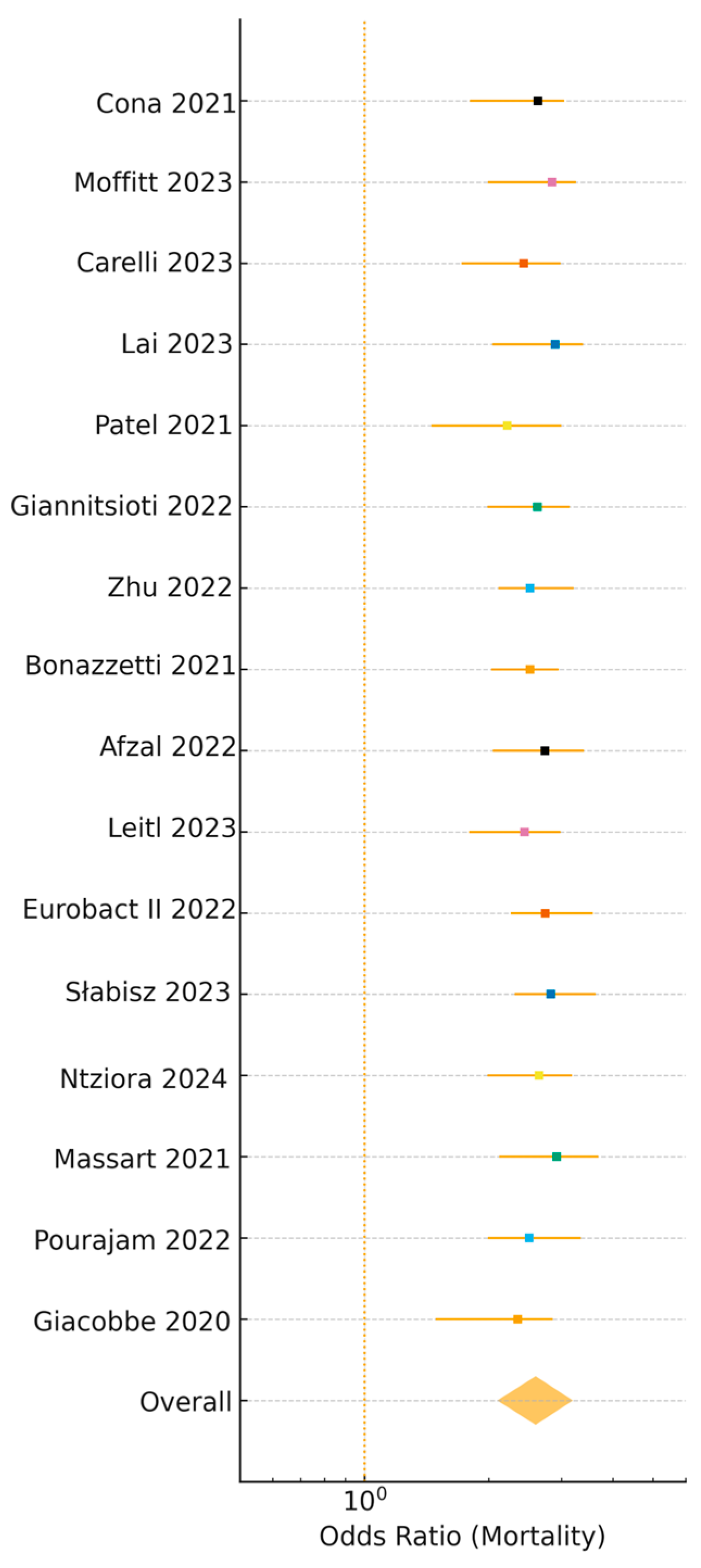 | Mortality (OR) | 2.6 | 2.1–3.2 | 1.6–4.1 | <0.001 | 47 | 16 [3,4,6,8,10,11,13,16,18,19,21,23,24,26,27,28] |