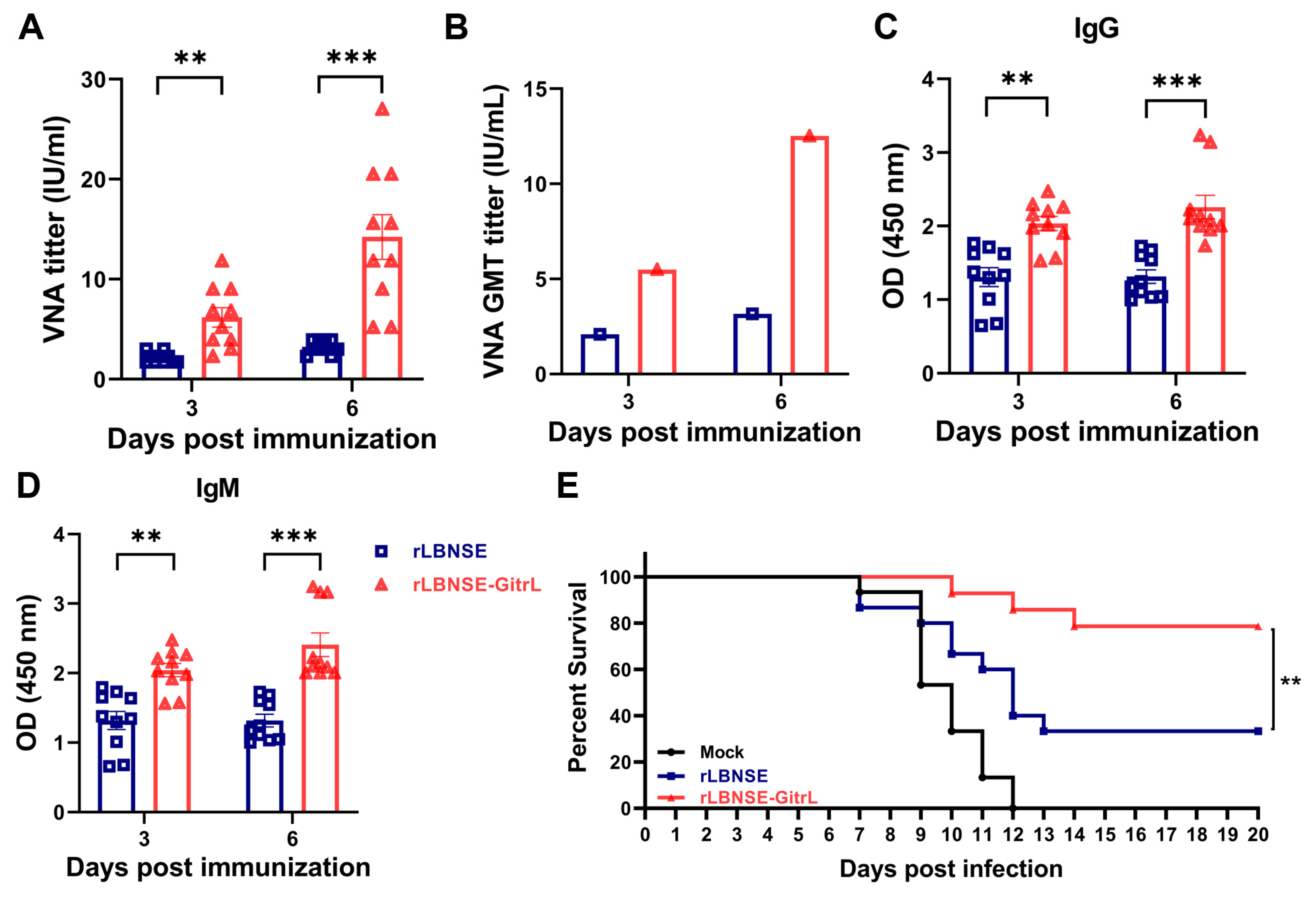 3.6. Overexpression of GitrL Improves Antibody Response and Protection Against Pathogenic RABV Challenge