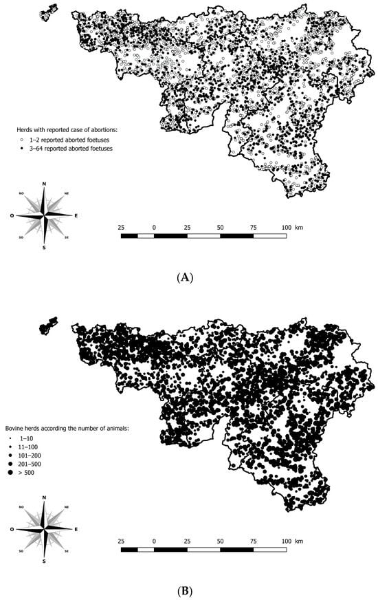 Geographical distribution of herds with a minimum of one aborted foetus reported and analysed in the southern region of Belgium, between 2021 and 2024. (A) Geographical distribution of herds according to the number of aborted foetuses reported. (B) Geographical distribution of bovine herds according to the number of animals. Legend: The five provinces of the southern part of Belgium are delimited by a solid line (i.e., Hainaut, Brabant Wallon, Liège, Luxembourg, and Namur).