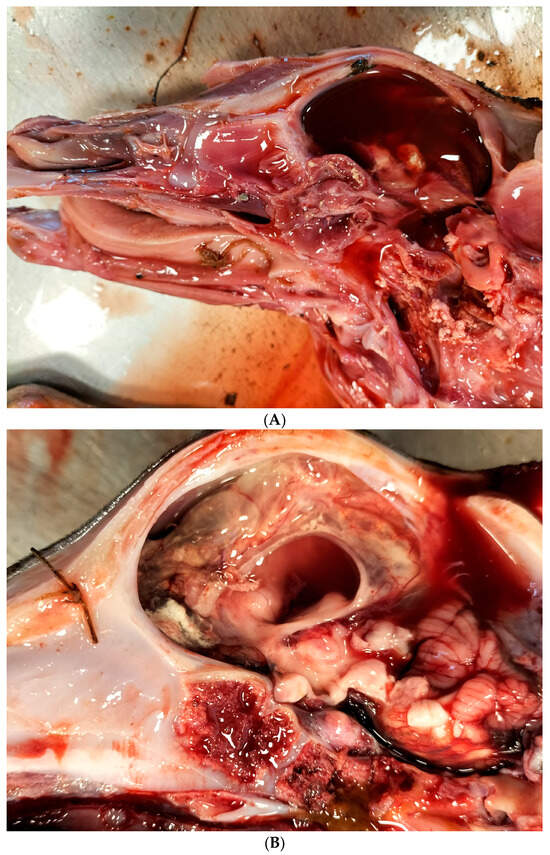 According to the abortion monitoring, the main clinical signs reported during the epidemic was first, at the beginning of the month of August 2024 (week 31), an increase in the body temperature of the dam accompanied by abortions without congenital lesions (Appendix A). Two weeks later, CNS congenital lesions on aborted foetuses including hydranencephaly (Figure 2A,B), hydrocephaly, microcephaly, porencephaly, and mucosal ulcerations (Figure 2C) at the level of the tongue were observed on an aborted foetus.