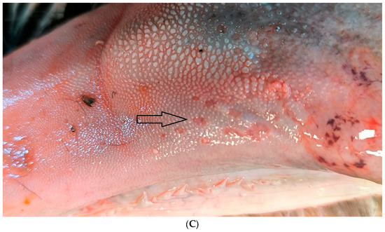 Typical congenital lesions observed in the necropsy room in BTV-3 confirmed foetuses. (A) Hydranencephaly on 7-month-old bovine aborted foetus. (B) Hydranencephaly on 8-month-old bovine aborted foetus. (C) Ulcerations on the tongue of a 9-month-old bovine aborted foetus.