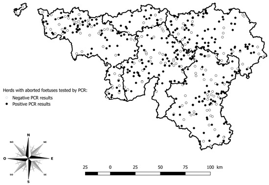 The virus transmission is normally limited to those times of the year when adult insects are active [8]. The spatial spread of PCR-positive abortions across southern Belgium suggests widespread vector activity, likely sustained by favourable climatic conditions, a dense population of Culicoides, and a long-distance wind dispersal of Culicoides spp. estimated week by week [24].