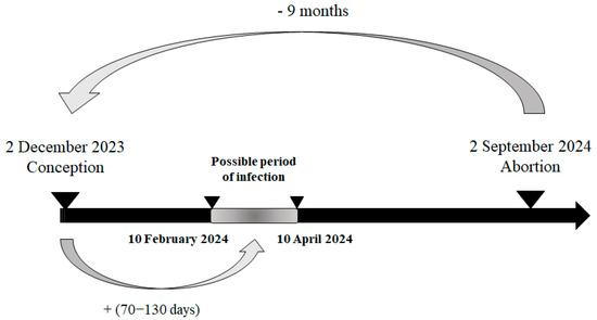 Based on the reported gestational stage of the necropsied foetuses, it was possible to estimate their date of conception and, consequently, the likely at-risk period for infection. During week 36, on 2 September 2024, the foetus with the earliest estimated at-risk period was reported. This case concerned a 9-month-old Holstein foetus from Luxembourg province, also affected by hydranencephaly. The estimated date of conception was 2 December 2023, with the likely at-risk period for infection—between the 70th and 130th day of gestation—falling between 10 February 2024 and 10 April 2024, corresponding to epidemiological weeks 6 to 15 of 2024 (Figure 4).