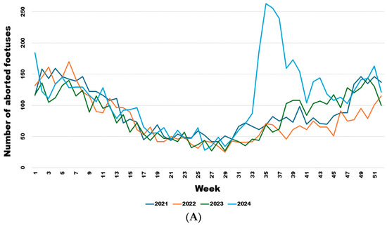 From week 34 onwards, the number of abortions increased significantly (Figure 5A), even though the virus had already been detected in southern Belgium for several weeks in adult animals but not in aborted foetuses. Comparing the weekly trend in the number of abortions in 2024 with the previous three years (Figure 5B), it is clear that this was a significant sharp increase in abortions that began in August (week 34) (Wald test for a structural break = 126.17 and p-value < 0.0001) and continued until the end of November (week 47) (Wald test for a structural break = 8.26 and p-value = 0.016).