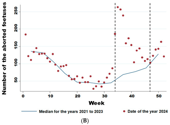 Weekly evolution of reported bovine aborted foetuses for the years 2021–2024 (A) and of the difference between the average bovine aborted foetuses during the 3 years before the epidemic and the number for the year 2024 (B). Legend: The first vertical dotted line corresponds to the starting break of the epidemic wave in week 34 (Wald test for a structural break = 126.17 and p-value < 0.0001). The second vertical dotted line corresponds to the end of the epidemic wave in week 47 (Wald test for a structural break = 8.26 and p-value = 0.016).